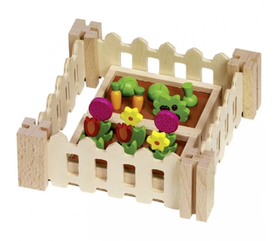 Très bel ensemble de 32 pièces en bois coloré (mini légumes, fleurs, brouette, panier, arrosoir, bordure…) C’est rigolo ! Pour jouer aux apprentis jardiniers qui apprennent comment faire pousser les légumes et les fleurs, imiter les parents qui jardinent… Set de pièces jardin miniature de belle qualité.
