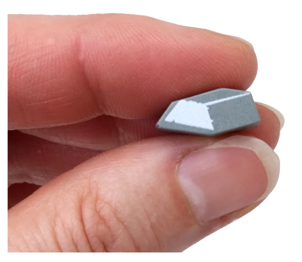 Pion de jeu en forme de lingot de métal gris pour représenter l’argent ou l’aluminium. Petit jeton en bois imprimé sur les 2 faces.