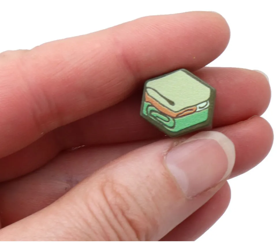 Jeton marron hexagonale d’environ 1.6 cm de diamètre et 1 cm d’épaisseur. Impression couleur jaune, rouge, vert et blanc sur les deux faces du jeton?