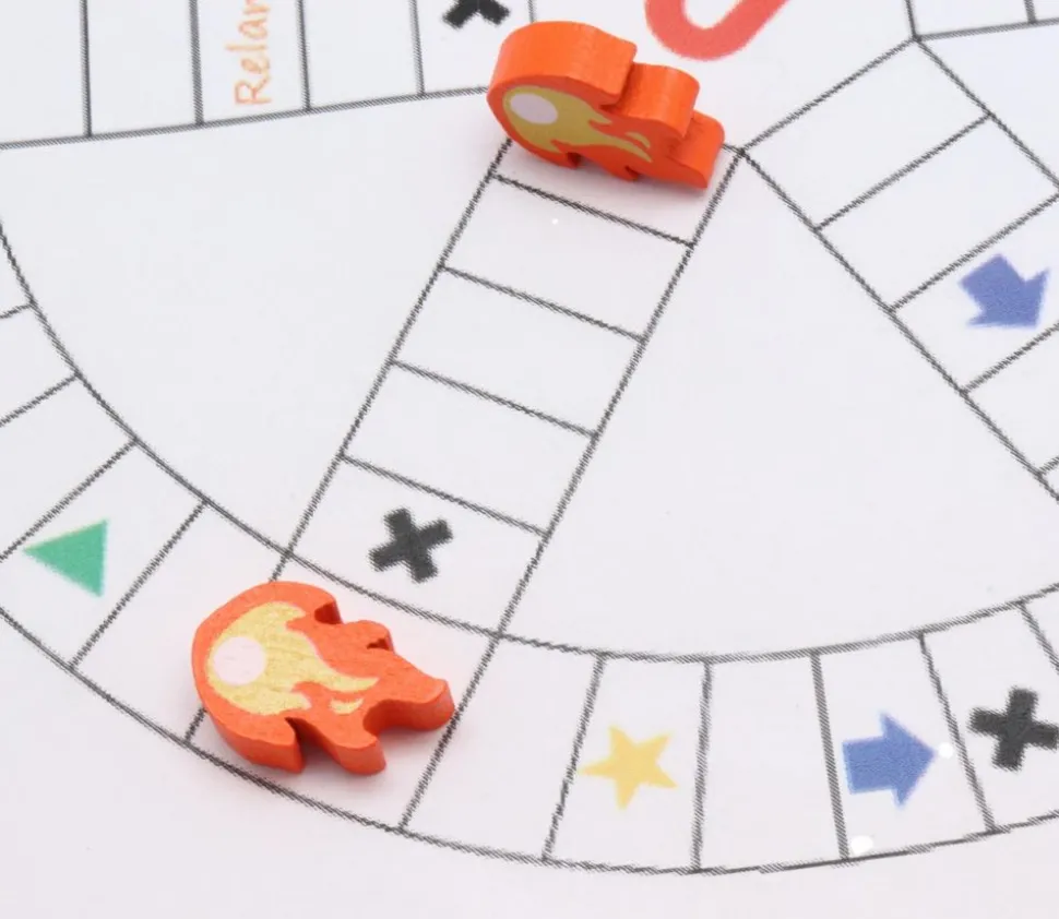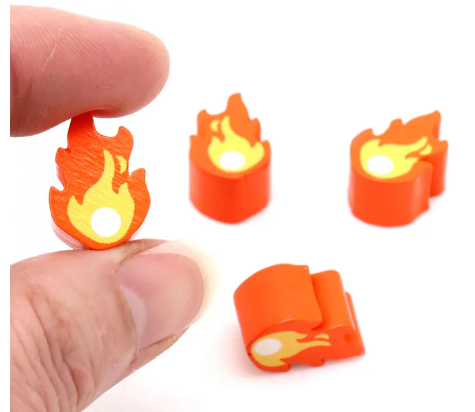 Jeton flamme en bois teinté à utiliser comme ressource pour vos jeux de société.