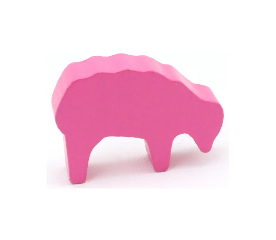 Pion mouton rose en bois. Le mouton rose dans votre bergerie pour compléter avec les moutons d’autres couleurs. Pion en bois hêtre pour jouer et créer vos jeux de société. Pion de jeu mouton teinté en rose de 40 x 28 x 10 mm. Achat de pions de jeux de formes diverses.