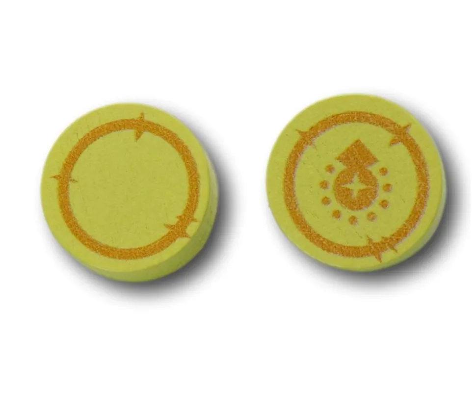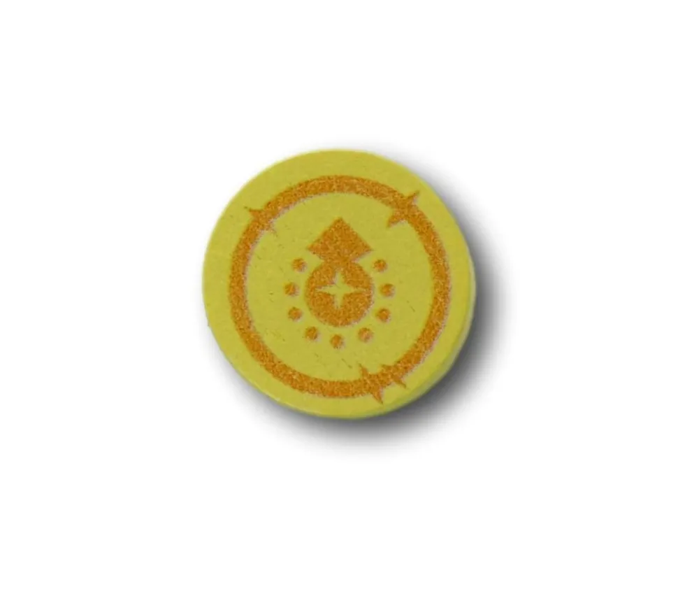 Pion de jeu Pièce d’Or. Pièce en bois forme de Pièce d’Or teinté en jaune qui peut servir de ressources dans vos jeux comme or. Jeton rond jaune avec décor orangé symbolisant les pièces d’or et pouvant être utiliser en Monnaie pour vos jeux de société thématique Moyen Age, petit commerce ou jeton Ressource pour vos jeux de stratégie ou jeu de rôle RGP