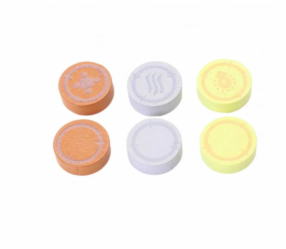 Pion pièce d’or en bois teinté en jaune et illustré en orange différemment sur le recto et le verso. A utiliser comme ressource pour vos jeux de société. Pièces idéales pour créer vos jeux, décorations ou autres.