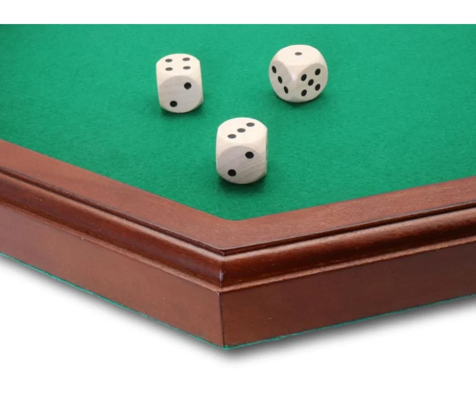 Piste à dés octogonale en tilleul verni et teinté de 38 cm de diamètre. L’intérieur de la piste est recouvert d’une feutrine verte, le dessous de la piste également. Cette piste pour jouer à de nombreux jeux de dés est livrée avec 3 dés de 16 mm en bois d’érable.