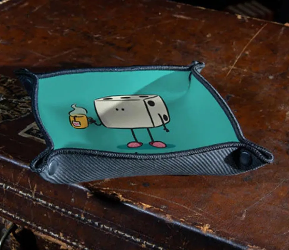 Une piste de dés avec un imprimé rigolo pour les fans du jeu ! Fond de couleur turquoise et un personnage dé à jouer qui boit un café dé-tox.