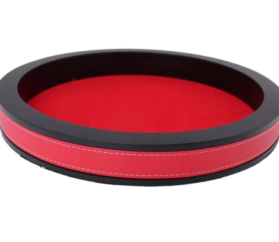 Superbe piste de dés luxe ronde de 30 cm de diamètre (dimensions extérieures) et 3.4 cm de hauteur. Feutrine rouge et tour noir cerclé par un bande cuir rouge. Une très belle piste classe.
