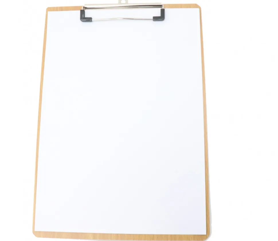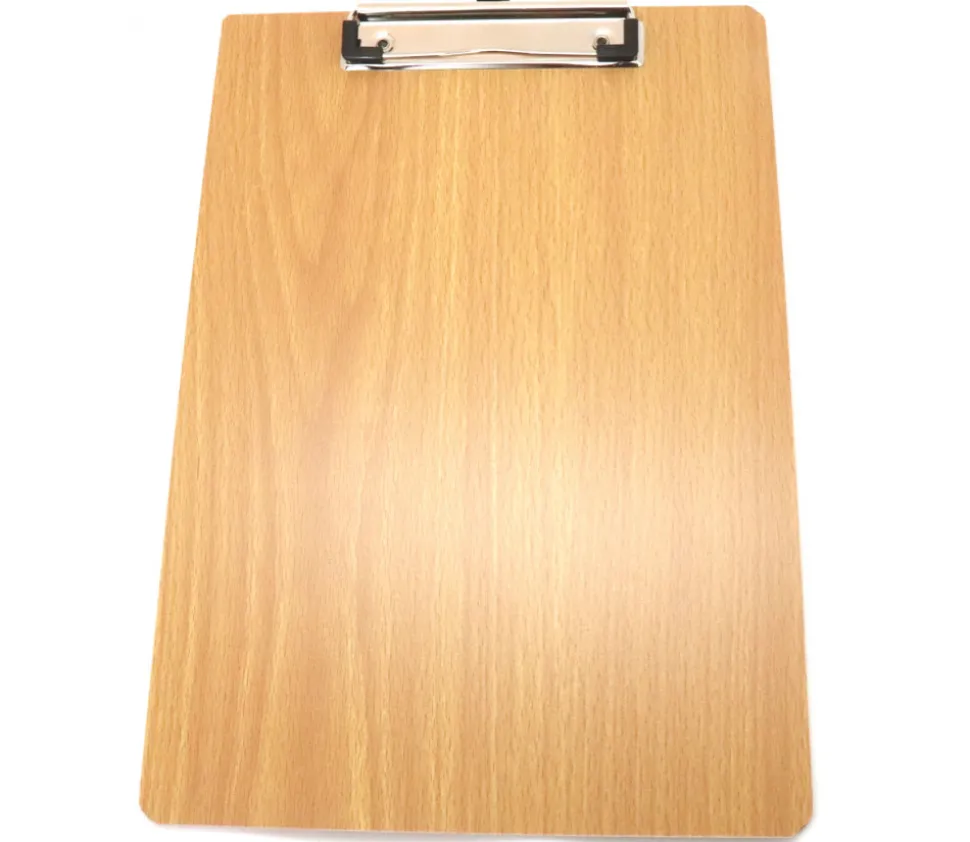 Plateau en bois contre-plaqué avec pince pour clipser les feuilles pour noter les points. Support rigide qui servira d’écritoire pour prendre des notes.
