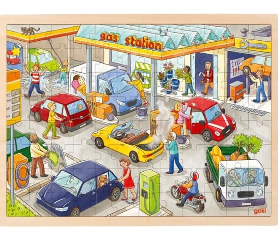 Magnifique puzzle en bois de 96 pièces sur le thème »chez le garagiste ».