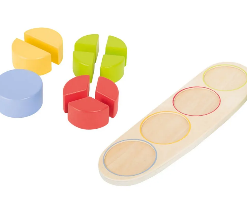 Jeu en bois pour initiation aux fractions. Les enfants apprennent le partage, grâce aux formes géométriques et aux couleurs.