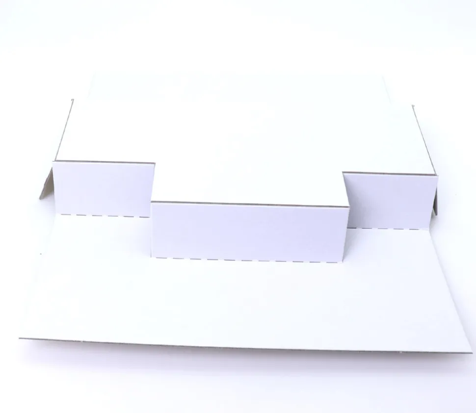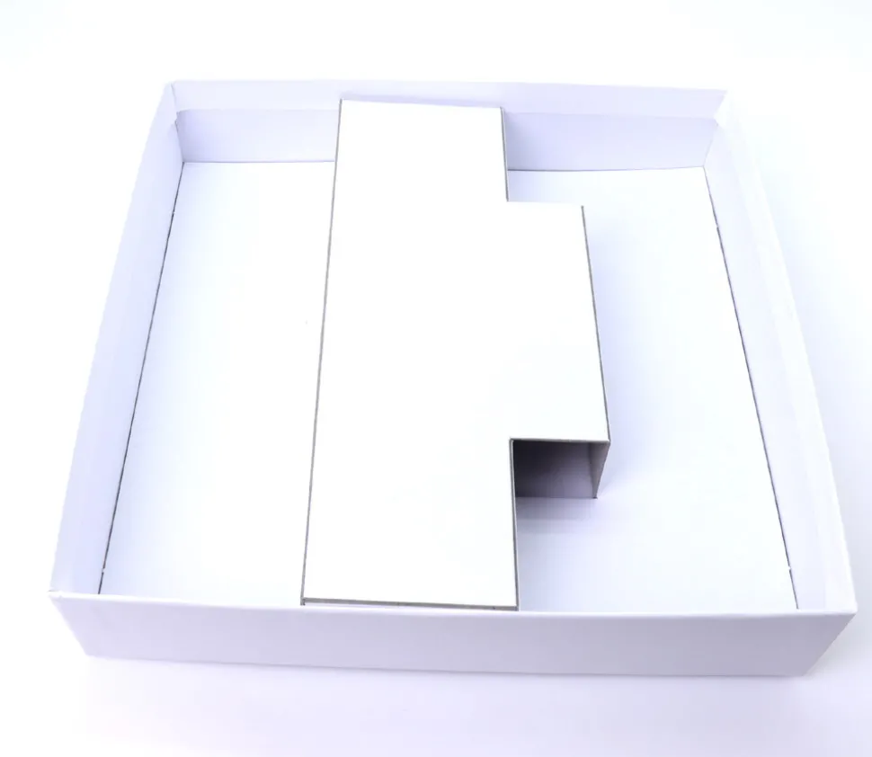 Support en carton blanc avec prédécoupage. Livré à plat. Sabot intérieur pour rangement avec 2 grandes zones. Une zone rectangulaire et une zone en forme de pont pour caler 2 jeux de cartes à jouer sur les côtés par exemple.