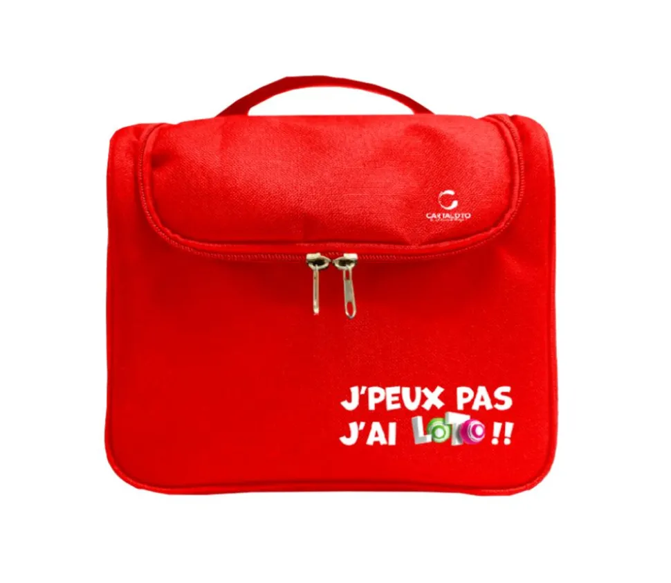 Sac loto super pratique pour ranger tous vos accessoires et matériel de loto bingo. Sac à main type vanity avec poignée de rangement avec message drôle « J’peux pas J’ai LOTO !!« . Couleurs à choisir : bleu, rouge, violet ou noir.