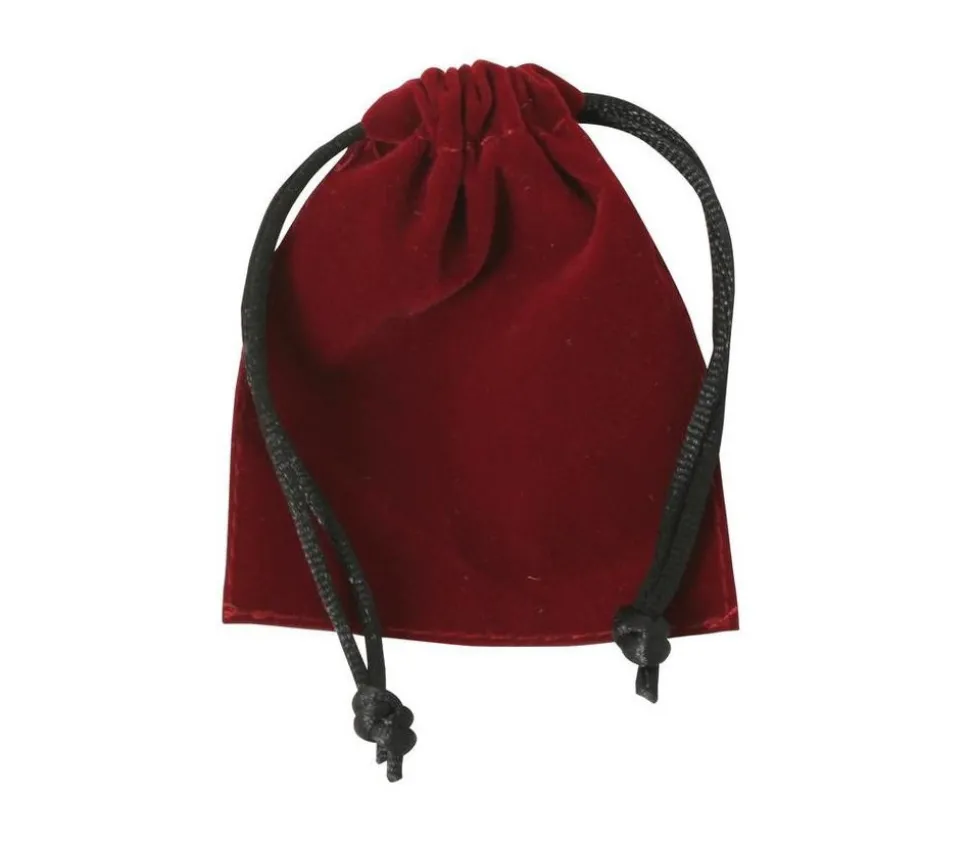 Petit sac rectangle effet suédine rouge/bordeaux de 85 x 70 mm avec cordon de fermeture noir. Ce sac permet de ranger environ 6 à 10 dés.
