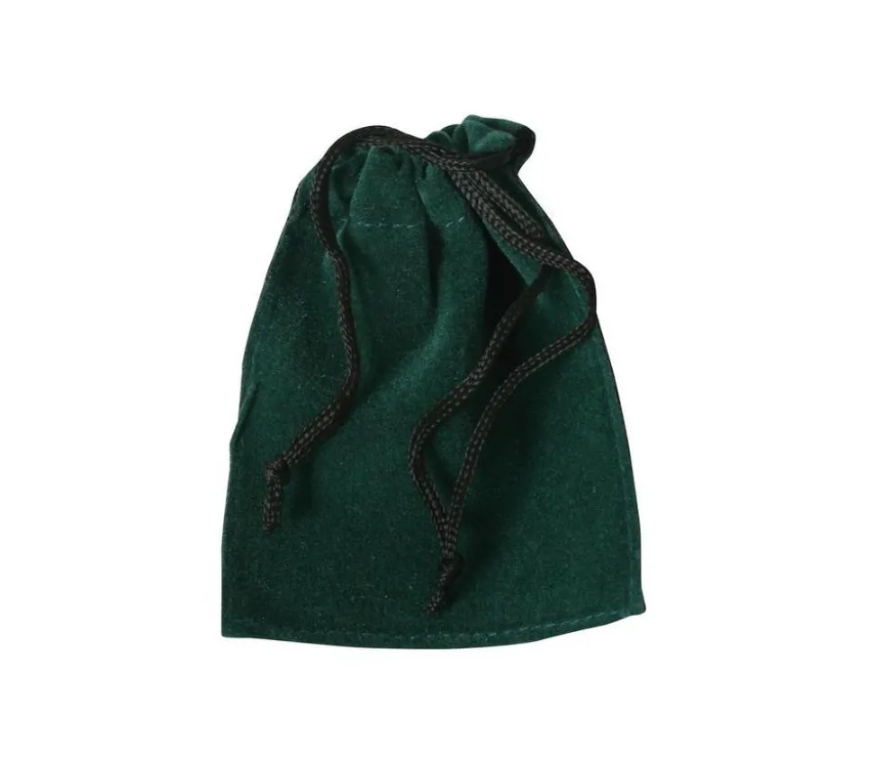 Petit sac rectangle effet suédine vert de 85 x 70 mm avec cordon de fermeture noir. Ce sac permet de ranger environ 6 à 10 dés.