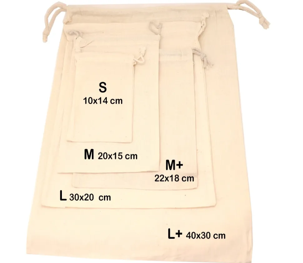 Sac 100% coton équipé d’un cordon de serrage pour le fermer.