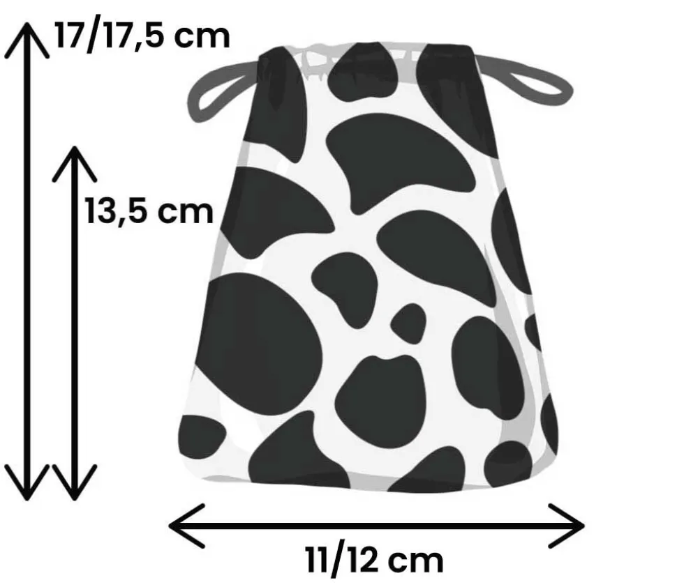 Sac touché velours effet « vache » tacheté noir. Sac d’environ 17 x 12 cm pour accessoires de jeu ou comme conditionnement pour vos petits produits.
