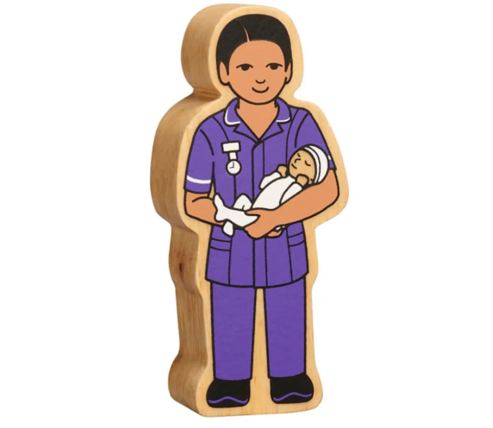 Pion personnage sage-femme en bois massif. Grand pion en bois peint sur les 2 côtés représentant une sage-femme en tenue de travail violette ou bleue avec un bébé dans les bras. Super personnage pour jeux de société à thème médical. A combiner avec d’autres personnages (infirmier, chirurgien) pour création de jeux en bois avec ces jouets issus du commerce équitable. Pion de 100 x 40 x 25 mm vendu à l’unité.