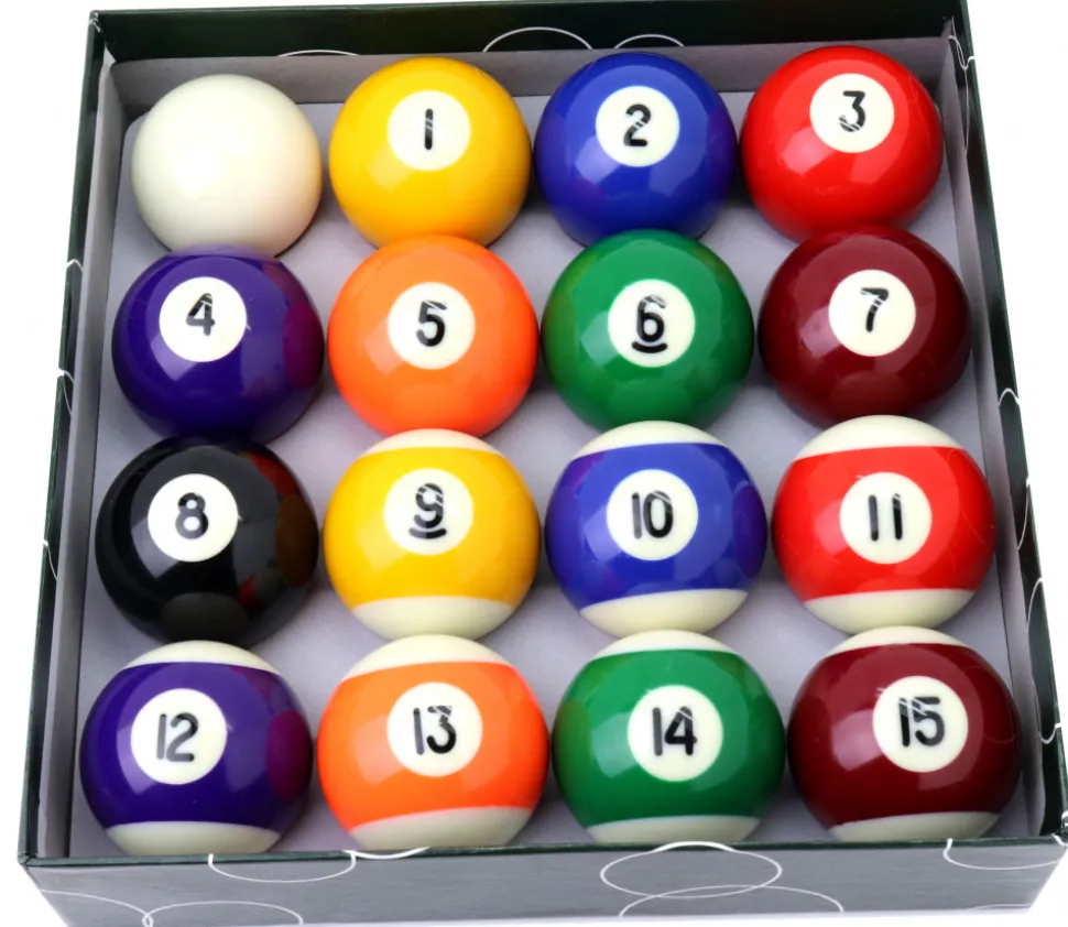 - 15 boules colorées avec numéros de 1 à 15 de 51 mm. 8 Billes pleines de 1 à 8 et 7 billes rayées de 9 à 15