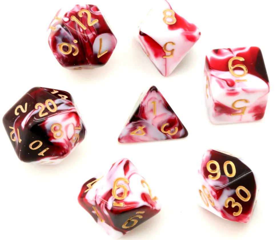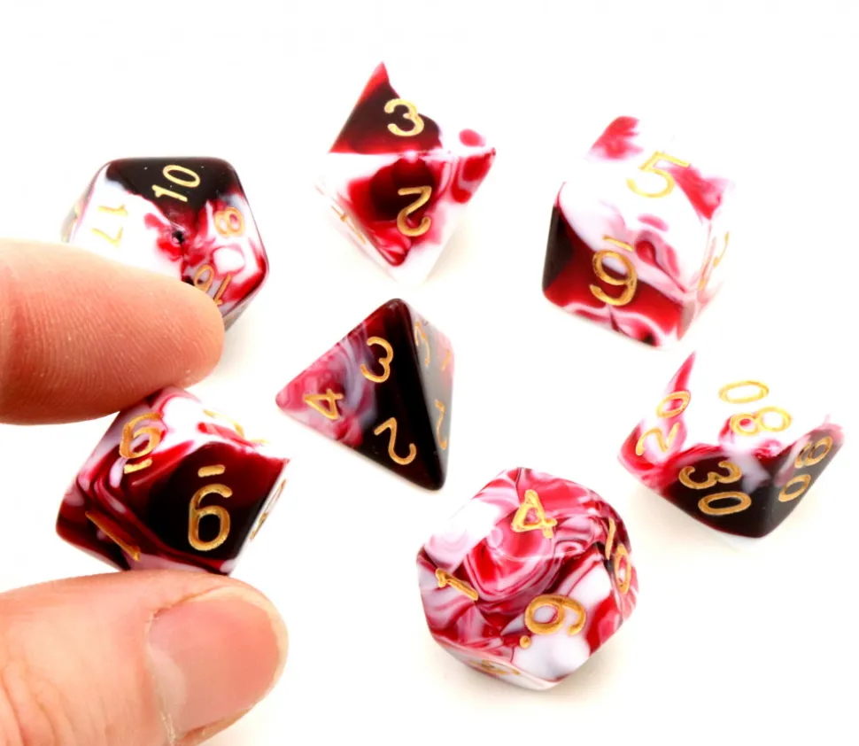 Couleur mélangée des dés : rouge/noir et blanc. Gravage des chiffres en couleur or. Le mélange de peinture est aléatoire et fait de jolis effets mais nous ne pouvons garantir l’effet que vous aurez dans votre lot. Chaque dé est unique.