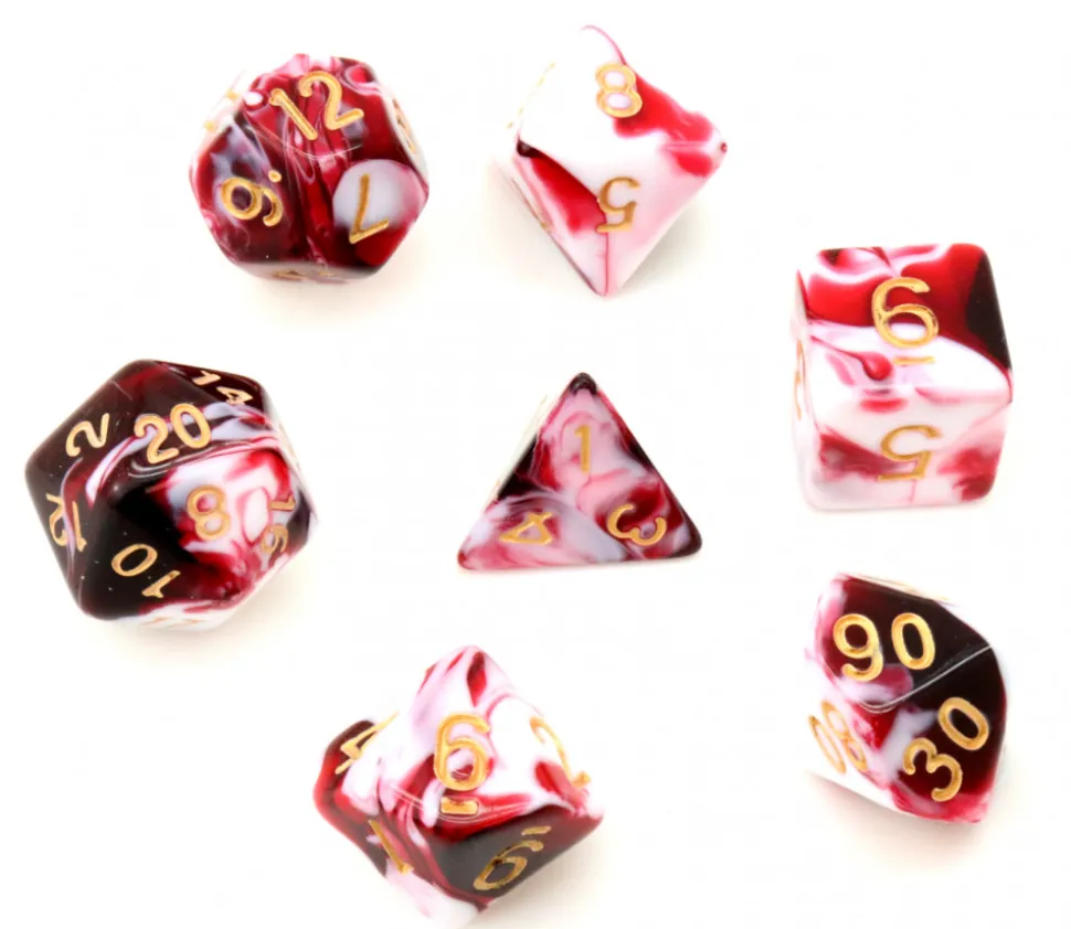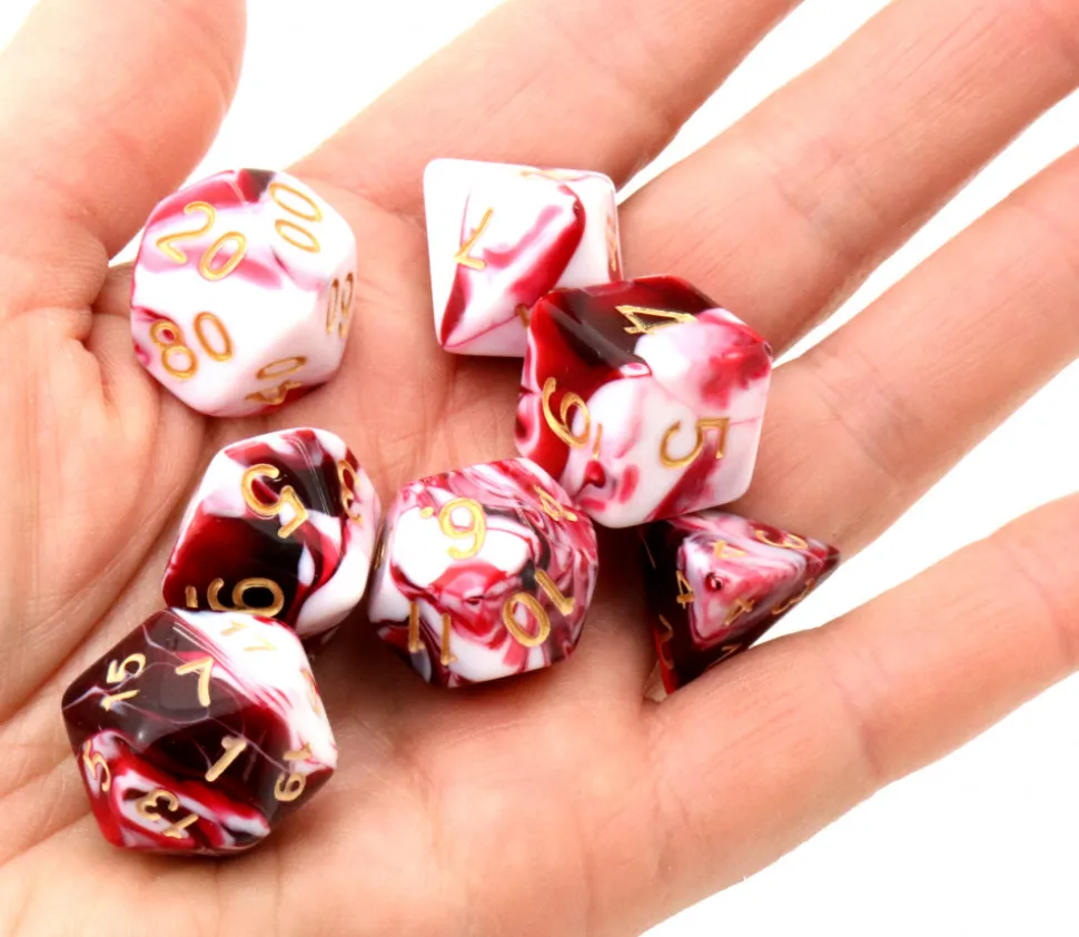 Lot de 7 dés à jouer multi-faces rouges et blancs avec chiffres dorés.