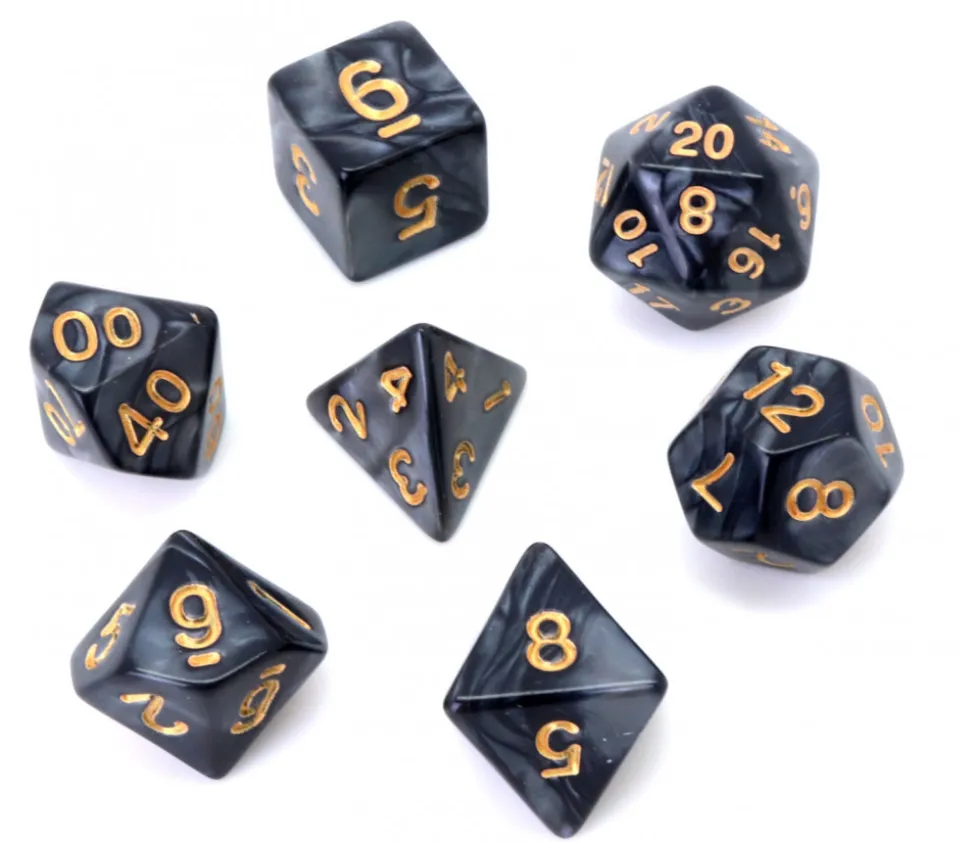 Ensemble de 7 dés à jouer multi-faces noirs nacrés et chiffres dorés.