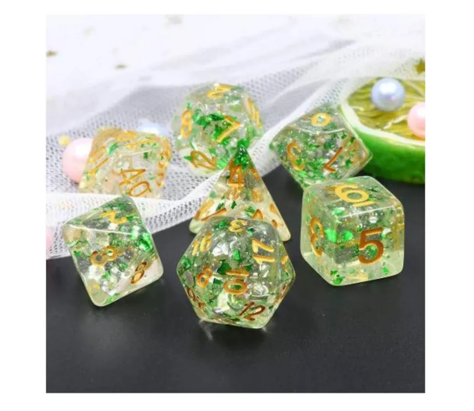 Le set comprend 7 dés multi-faces Green flakes avec des paillettes vertes dans un tube transparent :