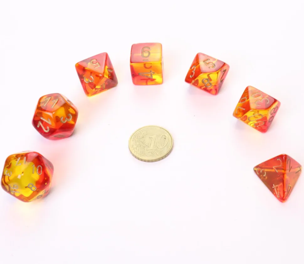 Set de 7 dés polyédriques translucides bicolores rouge et jaune.