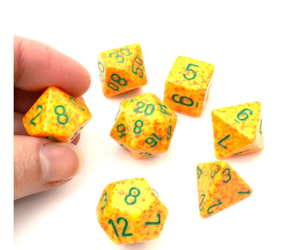 Set de 7 dés à jouer multifaces effet speckled Lotus couleur jaune/rouge chiffres en vert. Dé à faces multiples couleurs tachetées (jaune et rouge/orange en effet pointilliste). Lot de 7 dés sous forme de polyèdres : dé de 1 à 8, dé de 0 à 9, dé de 1 à 12, dé de 1 à 6, dé de 1 à 20, dé pyramide 1234, dé des dizaines 00 à 90. Dé pour jeux de rôle, jeux de société ou math. Dé Chessex pour jouer mais tellement beau qu’on peut aussi les collectionner.