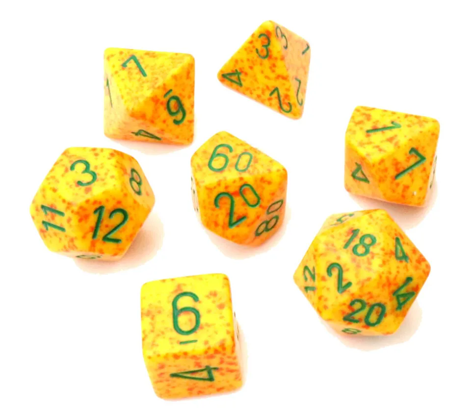 Dés à jouer polyèdres jaunes avec un effet de pointillé rouge/orange à l’intérieur. Les chiffres sont gravés en vert sur les faces. Superbe qualité qui donne envie de jouer de longues parties. Agréable au lancer.