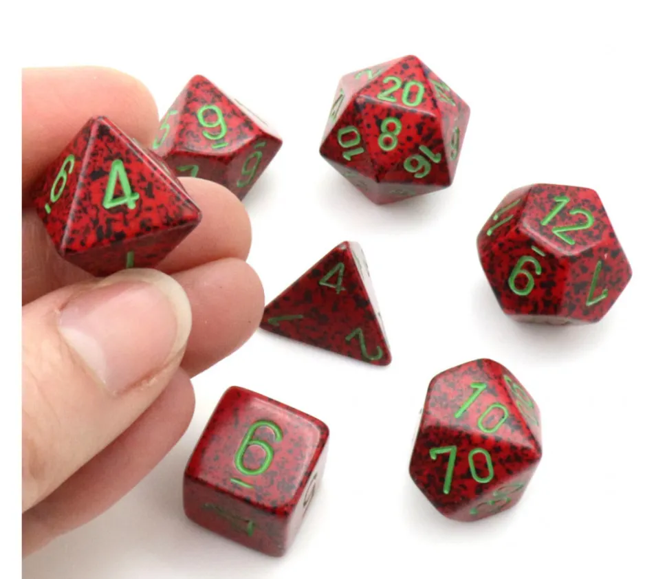 Set de 7 dés à jouer multifaces effet speckled Strawberry couleur rouge chiffres en vert. Dé à faces multiples couleurs perlées (rouge avec pointillisme noir) : dé de 1 à 8, dé de 0 à 9, dé de 1 à 12, dé de 1 à 6, dé de 1 à 20, dé pyramide 1234, dé des dizaines 00 à 90. Dé pour jdr ou jeux de société. Dé super qualité Chessex.