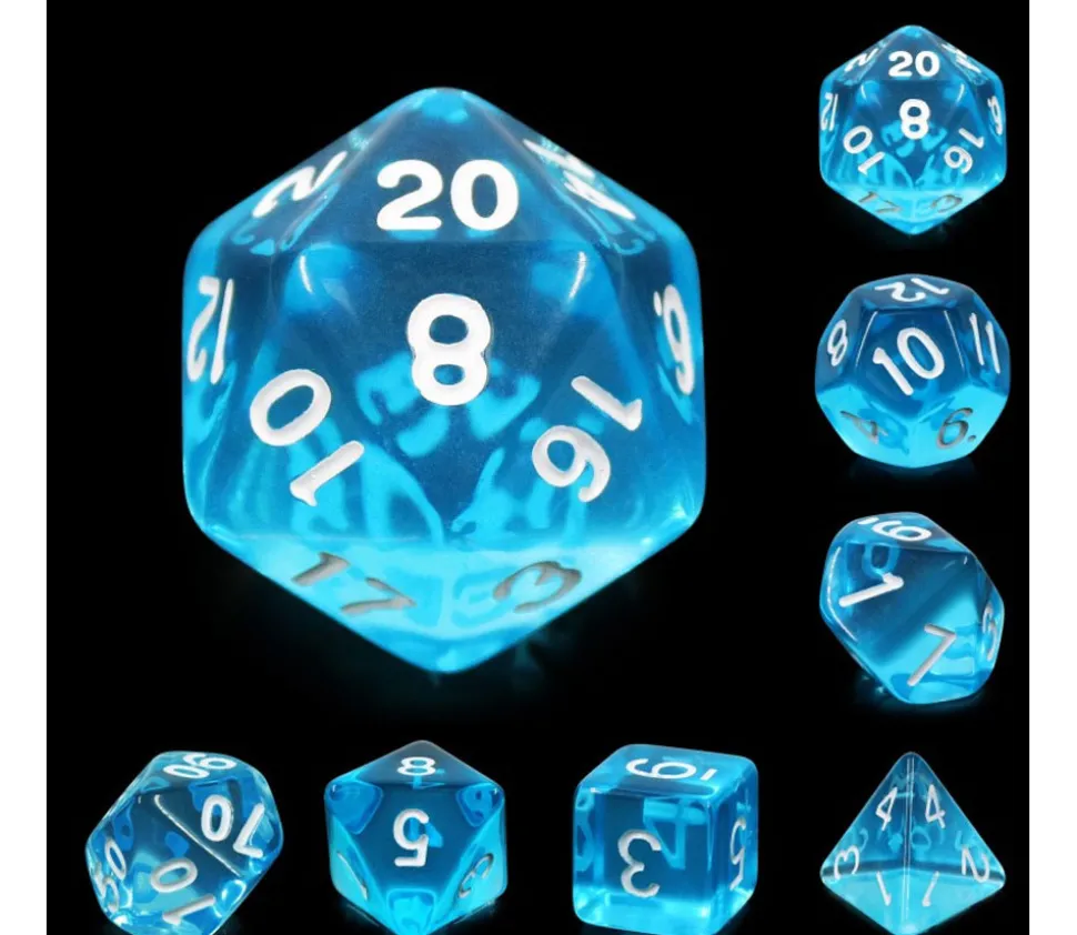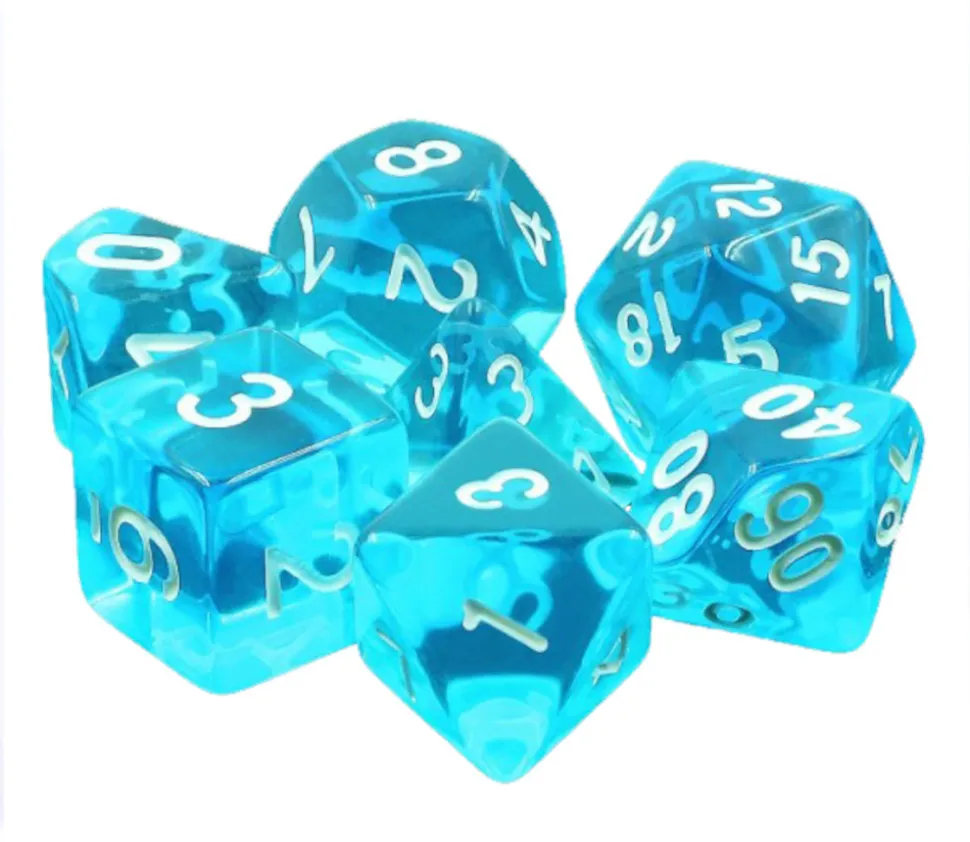 Lot de 7 dés à jouer multi-faces translucides bleus avec chiffres blancs. Magnifiques dés bleus transparents comme de l’eau.