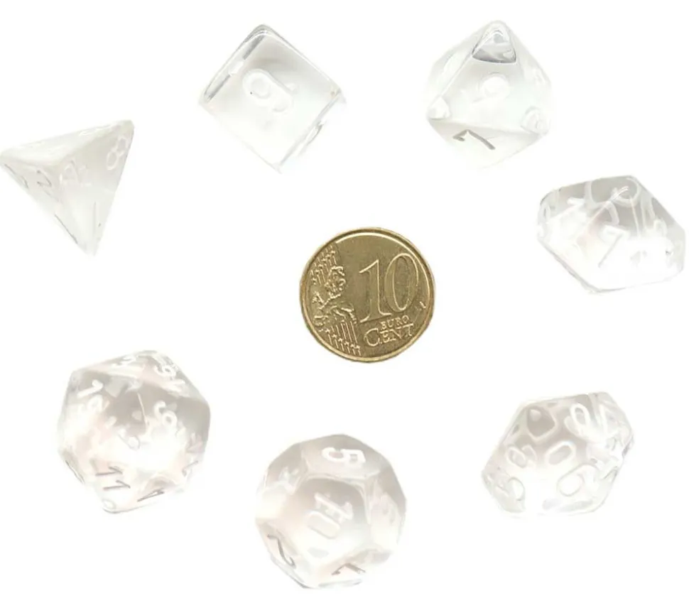 Set de dés multifaces de couleur translucide.