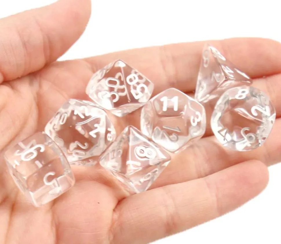 Set de 7 dés à jouer multi-faces translucides avec chiffres gravés en blanc.