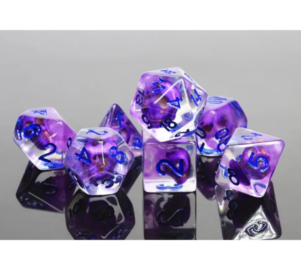 Lot de 7 dés à jouer multi-faces translucide avec tête de mort turquoise/violette à l’intérieur de chaque dé.