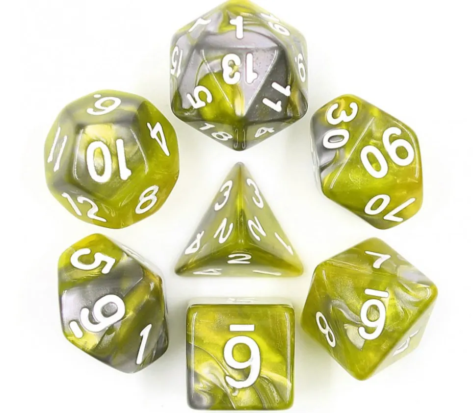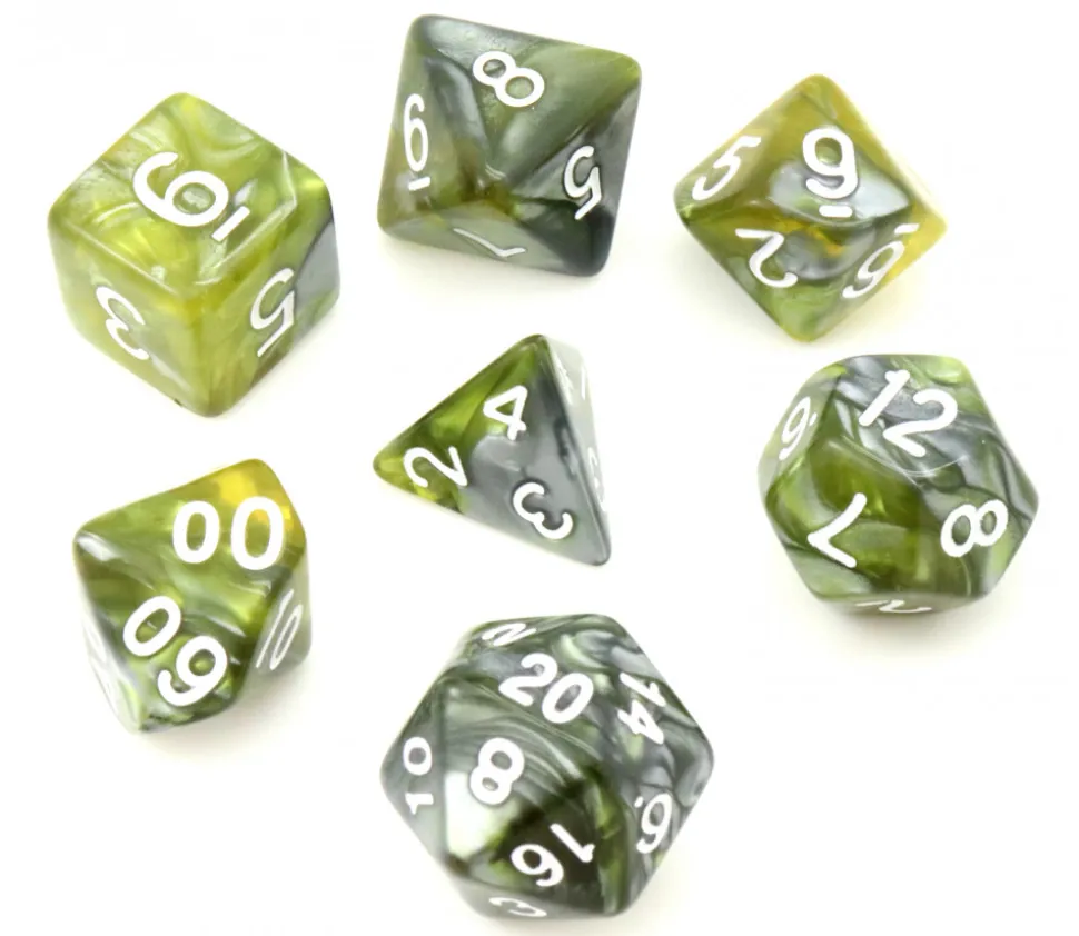 Lot de 7 dés à jouer multi-faces à effet verts et argents avec chiffres blancs. Très beau set de 7 dés multifaces.