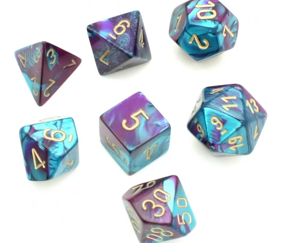 Lot de 7 dés à jouer gemini effet mixé violet et turquoise. Magnifique effet peinture mélangée. Dé chessex Gemini.