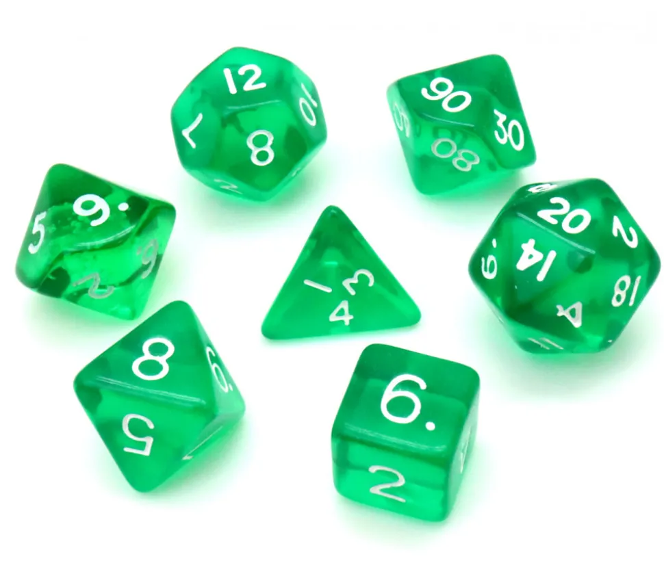 Set 7 dés à jouer multi-faces translucides verts. Lot de 7 Dés à faces variées : dé de 1 à 8, dé de 0 à 9, dé de 1 à 12, dé de 1 à 6, dé de 1 à 20, dé pyramide 1234, dé des dizaines 00 à 90. Lot de dés pour jeux de rôle ou jeux de stratégie.