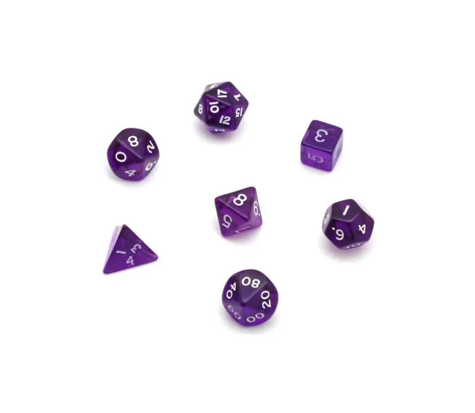 Set 7 dés à jouer multi-faces translucides violets. Lot de 7 Dés à faces variées : dé de 1 à 8, dé de 0 à 9, dé de 1 à 12, dé de 1 à 6, dé de 1 à 20, dé pyramide 1234, dé des dizaines 00 à 90. Lot de dés pour jeux de rôle ou jeux de stratégie.