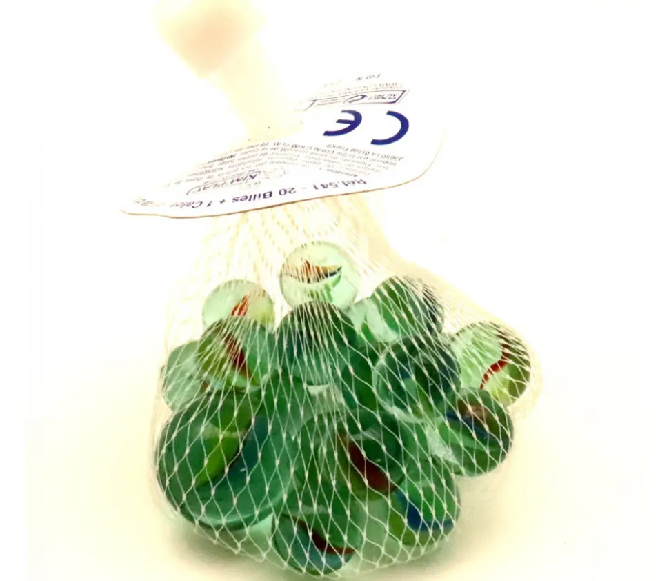 Lot 20 billes en verre pour jeux de billes classiques pour enfant avec 1 calot. Lot de différentes billes transparentes pas cher pour remplacer vos billes manquantes dans vos jeux de piste de billes, toboggans à billes, jeux de société divers.