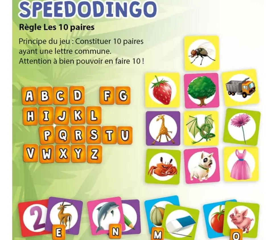 Les 10 paires (coopération-réflexion) : Ensemble les joueurs doivent réunir 2 cartes ayant une lettre commune et former une paire. La difficulté : bien choisir ses lettres pour réussir à constituer 10 paires.
