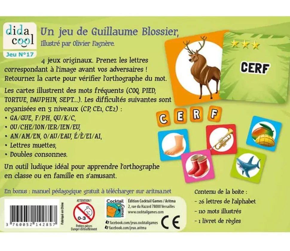 Le jeu est jouable en complète autonomie, car les solutions des exercices se trouvent aux dos des cartes – aucun adulte n’est requis pour s’amuser en apprenant. De plus, 4 règles différentes permettent de varier les parties et les façons d’aborder l’orthographe.