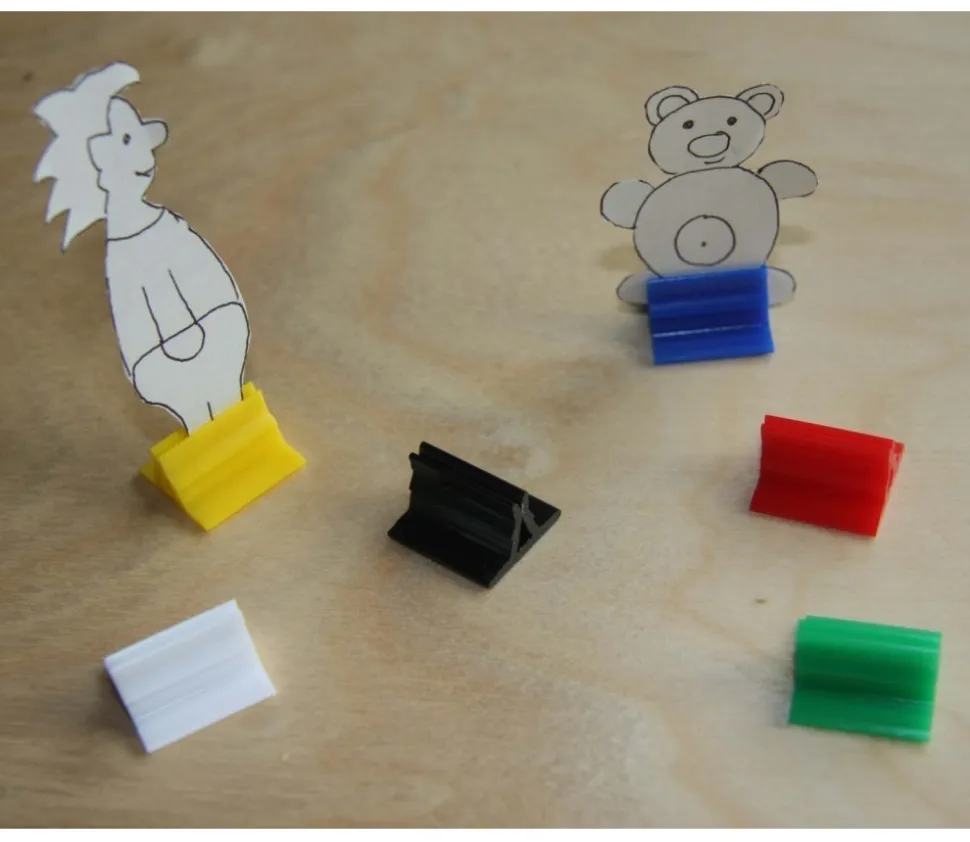 Pinces pour faire tenir debout vos cartes ou personnages de jeux de société que vous créez. Glissez tout type de créations sur fiche papier ou carton : bonhomme, animaux, dessins, photos… Support rectangulaire avec pince pour clipser votre jeton, visuel ou carte de jeux. Couleur violet. Existe dans d’autres couleurs. Vente pion à l’unité.