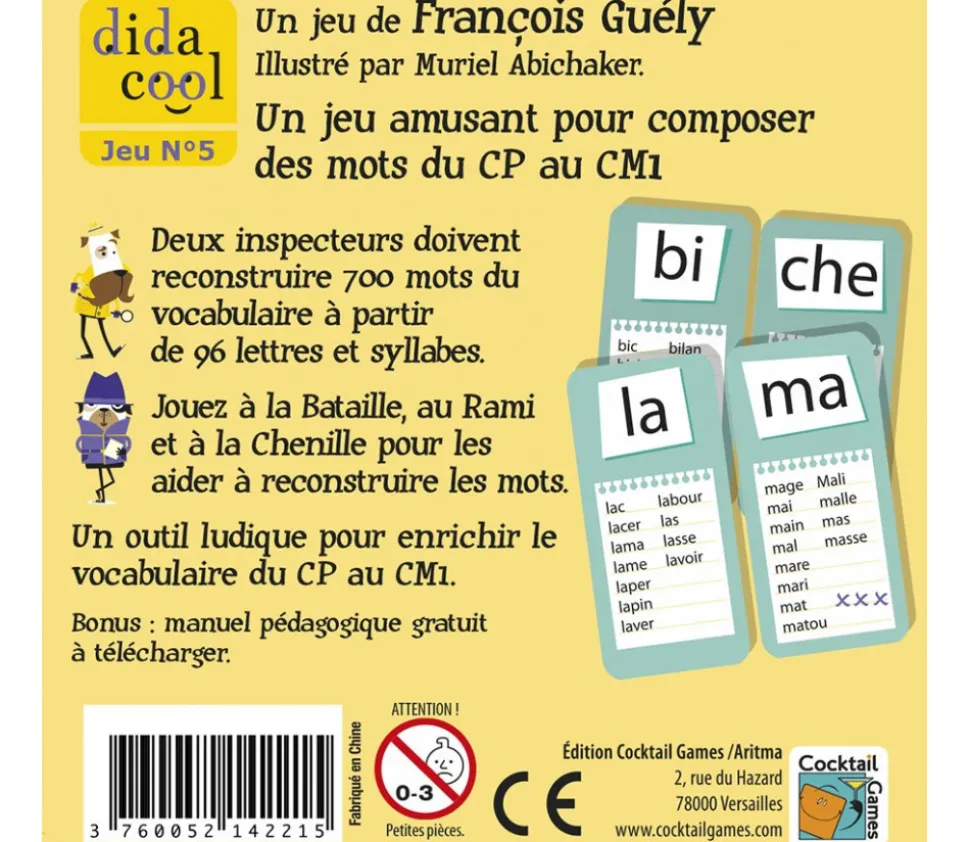 Sylladingo: 3 jeux de syllabe pour composer plus de 700 mots. Syllabe et vocabulaire du CP au CM1. Deux inspecteurs doivent reconstituer des mots à partir de lettres et de syllabes. Jeu rapide et rigolo qui favorise l’apprentissage, conçu en classe par des enseignants. Jeu 2 à 6 joueurs. Jeu pour la maison, la classe ou le soutien.