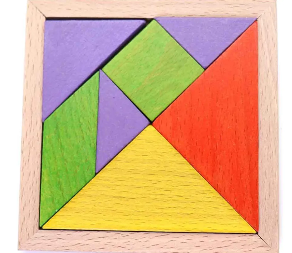 Jeu tangram coloré livré dans 1 cadre en bois de 12 x 12 cm.