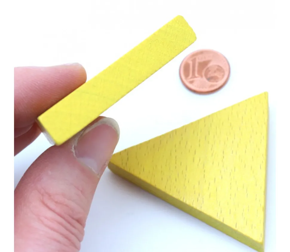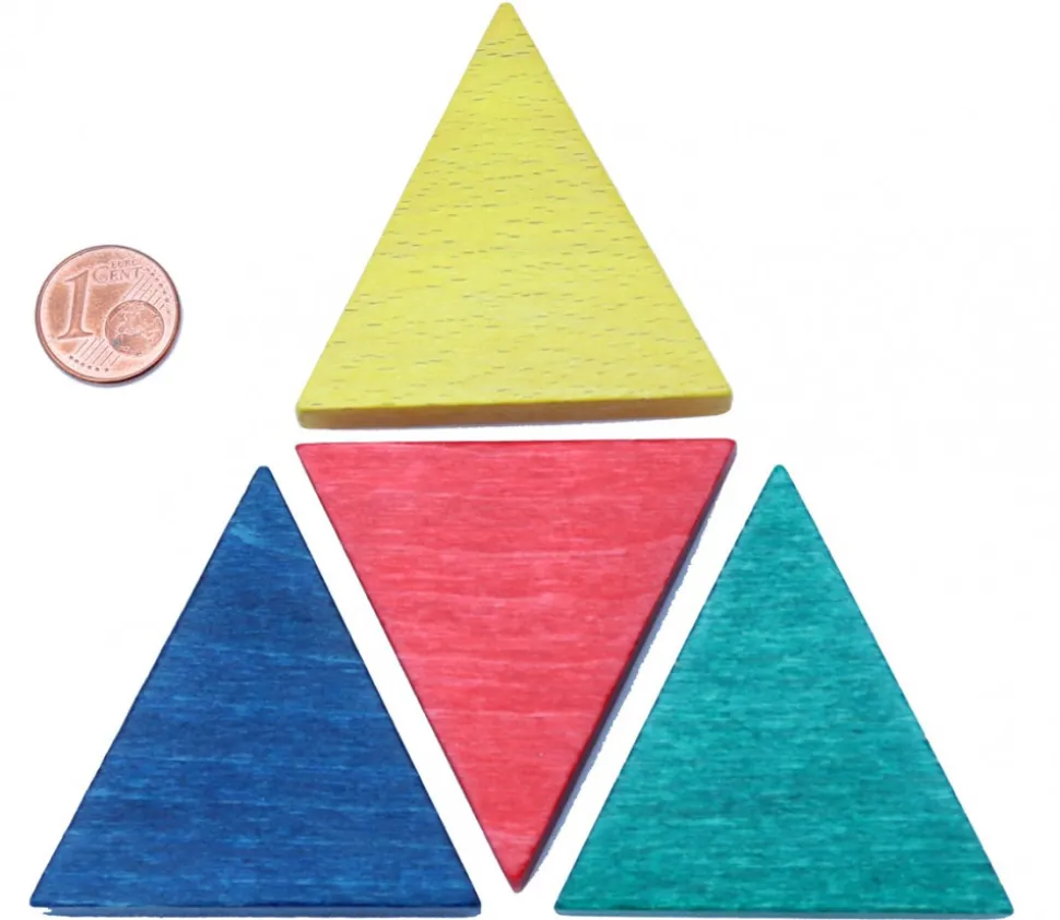 Pièces triangulaires en bois hêtre teinté en jaune. Triangles pions de 4.8 x 4.8 x 5.3 cm environ. Epaisseur : 8 mm.
