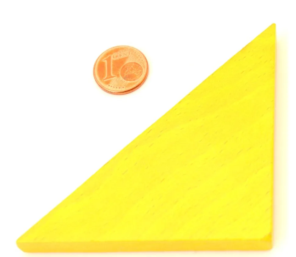 Pièces triangulaires en bois hêtre teinté en jaune. Triangles rectangle isocèle pions de 6.6 x 6.6 x 9.6 cm environ. Epaisseur : 8 mm.
