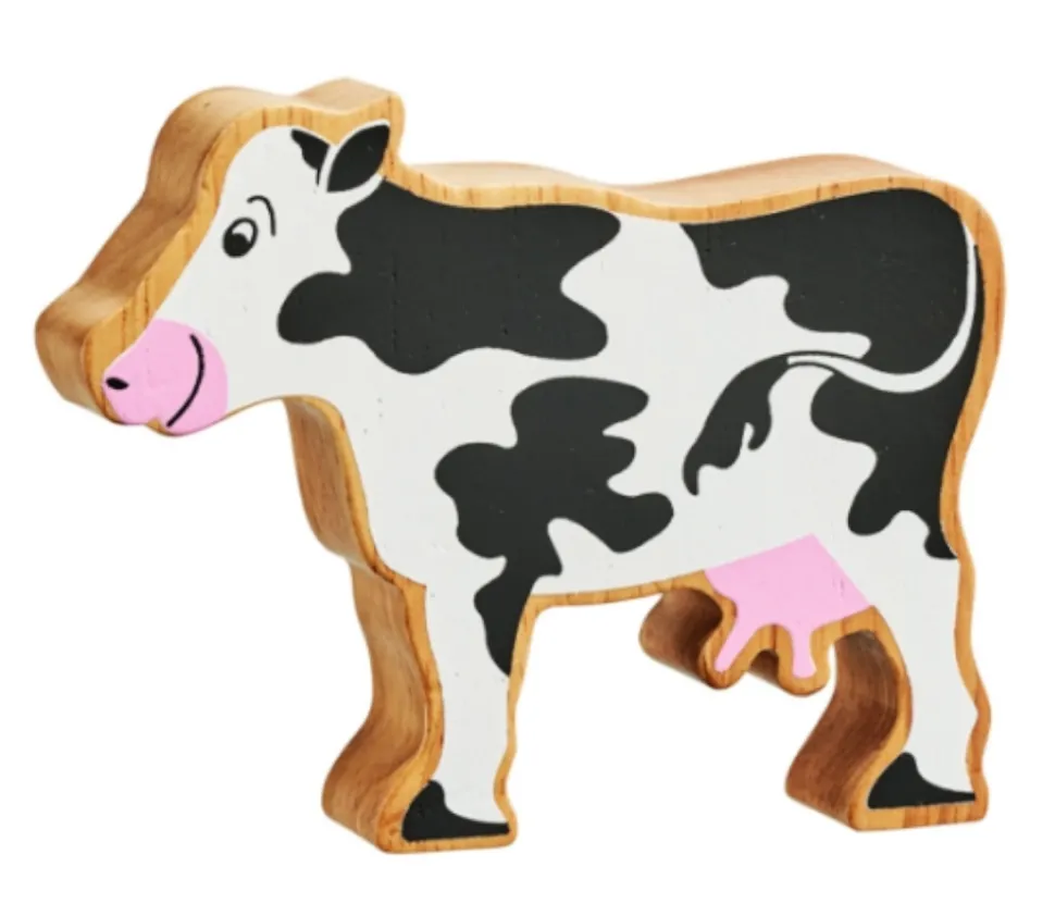 Pion vache en bois. Pion de jeu en bois très réaliste peint recto et verso. Petite vache en bois. Dimensions 120 x 95 x 25 mm. Animal de ferme peint en noir et blanc avec détail comme yeux, museau, pie. Pion de jeux de société ou jouet pour créer un mini monde. A combiner avec d »autres animaux pour création de mini ferme en bois avec ses jouets issus du commerce équitable.