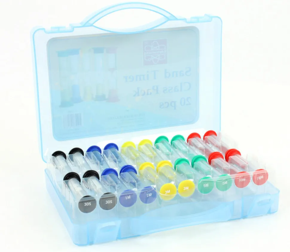 Valisette de 20 sabliers de jeu comprenant : 4 sabliers de 30 secondes, 4 sabliers 1 minute, 4 sabliers 3 minutes, 4 sablier 5 minutes, 4 sabliers de 10 minutes.