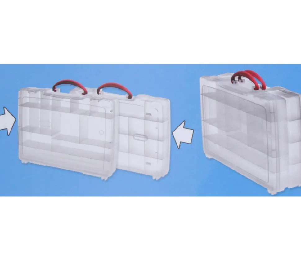 Boite valise de jeux neutre en plastique rigide grand format avec 14 compartiments de tailles différentes pour ranger vos accessoires de jeux de société. Valisette transparente pratique avec ses casiers. Grande boite valise en polypropylène transparent avec une poignée rouge. Valisette avec possibilité des les attacher ensemble.