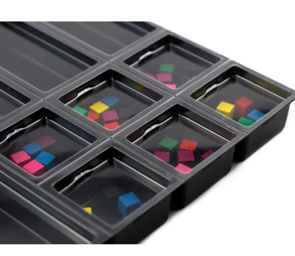 Grand plateau avec 18 casiers qui servent de subdivisions et qui vous permettent d’organiser vos composants de jeux de société.