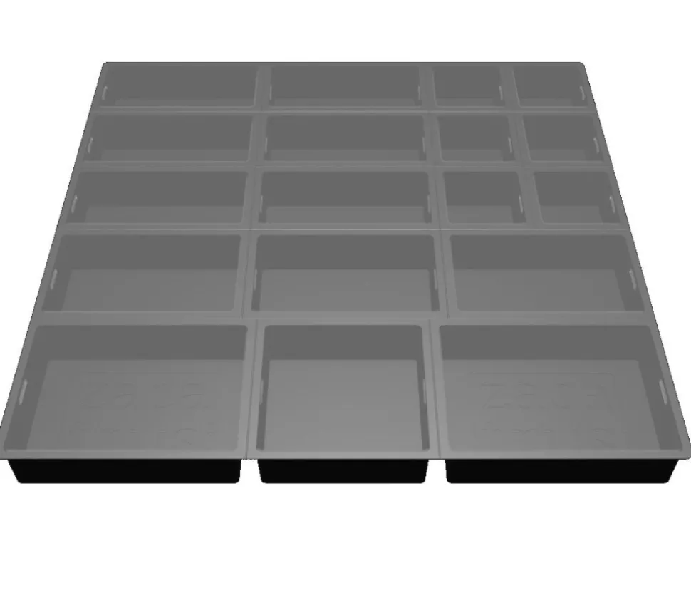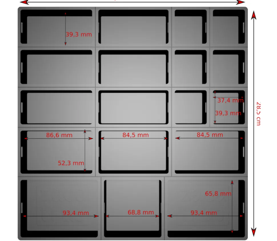 La zacabox est livrée sous forme d’un plateau noir assez rigide avec 18 subdivisions et un couvercle transparent. Vous pouvez facilement découper ce support pour créer 18 petites boites ou préférer créer un sabot aux dimensions de votre boite de jeux.